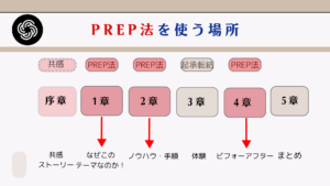 動画の中では、5章構成の電子書籍においてPREP法をどの章に使うと効果的かを図解で解説しています。