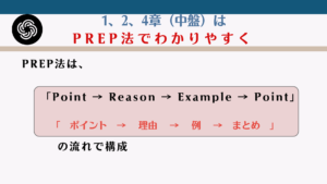現在「最短2週間で収益化できる電子書籍出版講座」の動画をリメイク中です。もともと50本だった動画がいつの間にか53本になり、その中でPREP法の解説を独立したレクチャーとして新たに追加することにしました。